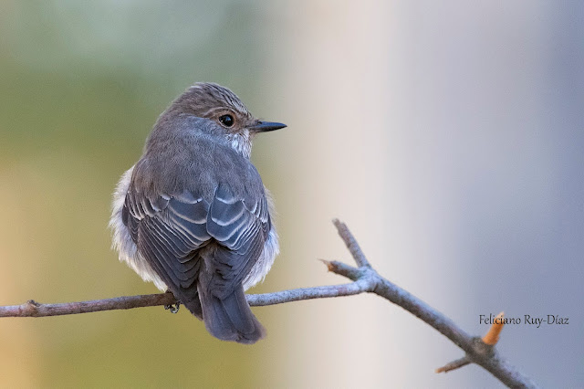 Descripción: Cabeza gris estriada, colores pardo grisáceos, pecho barrado de forma difusa. Pico oscuro, fuerte y largo. Patas cortas y negras, cola y alas largas, en general algo mayor que el Papamoscas cerrojillo. Ojo oscuro con anillo ocular pálido.